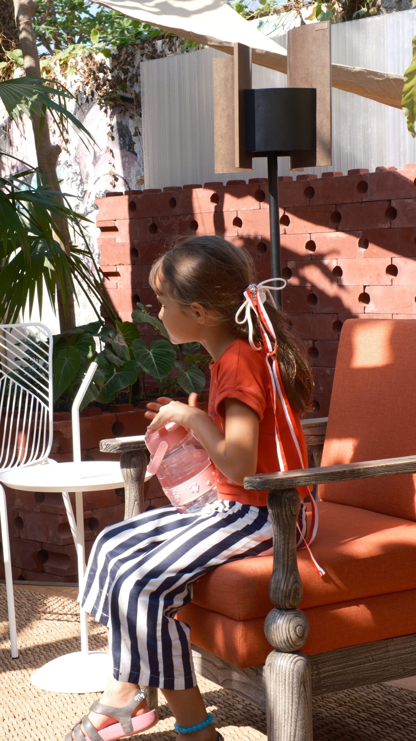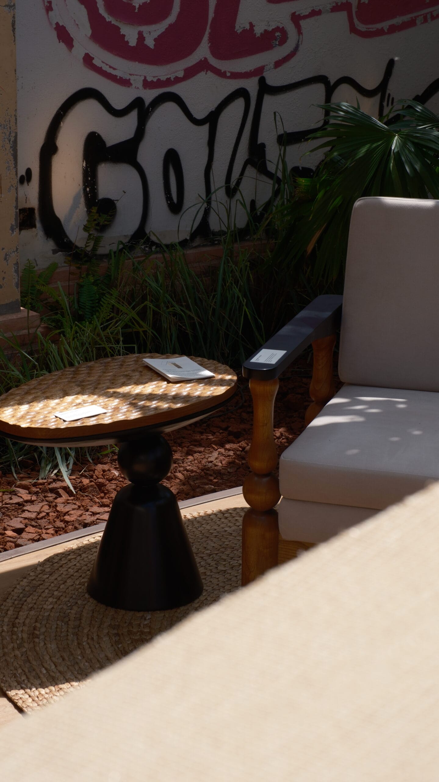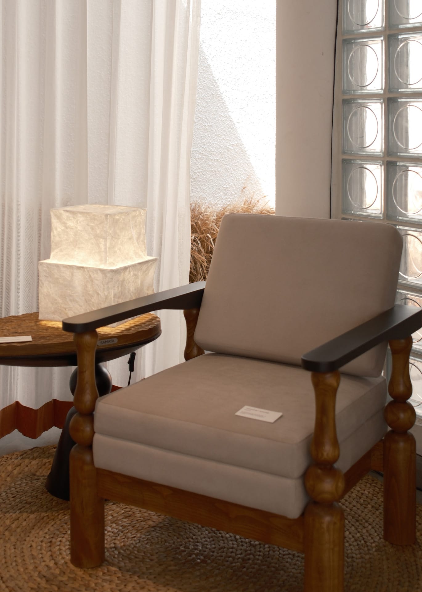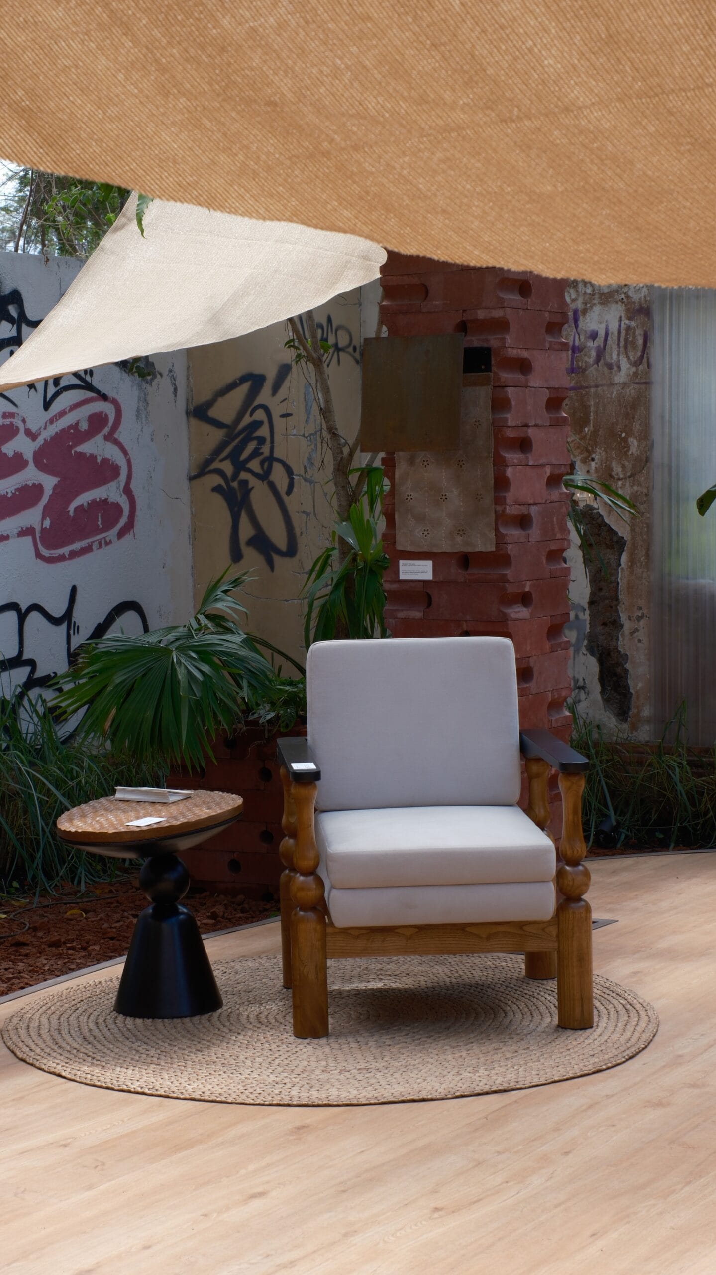 The geometrical repetition of the furniture’s legs echoes the shape of a caterpillar, while the furniture arrangement encourages us to sit, pause, and slow down.