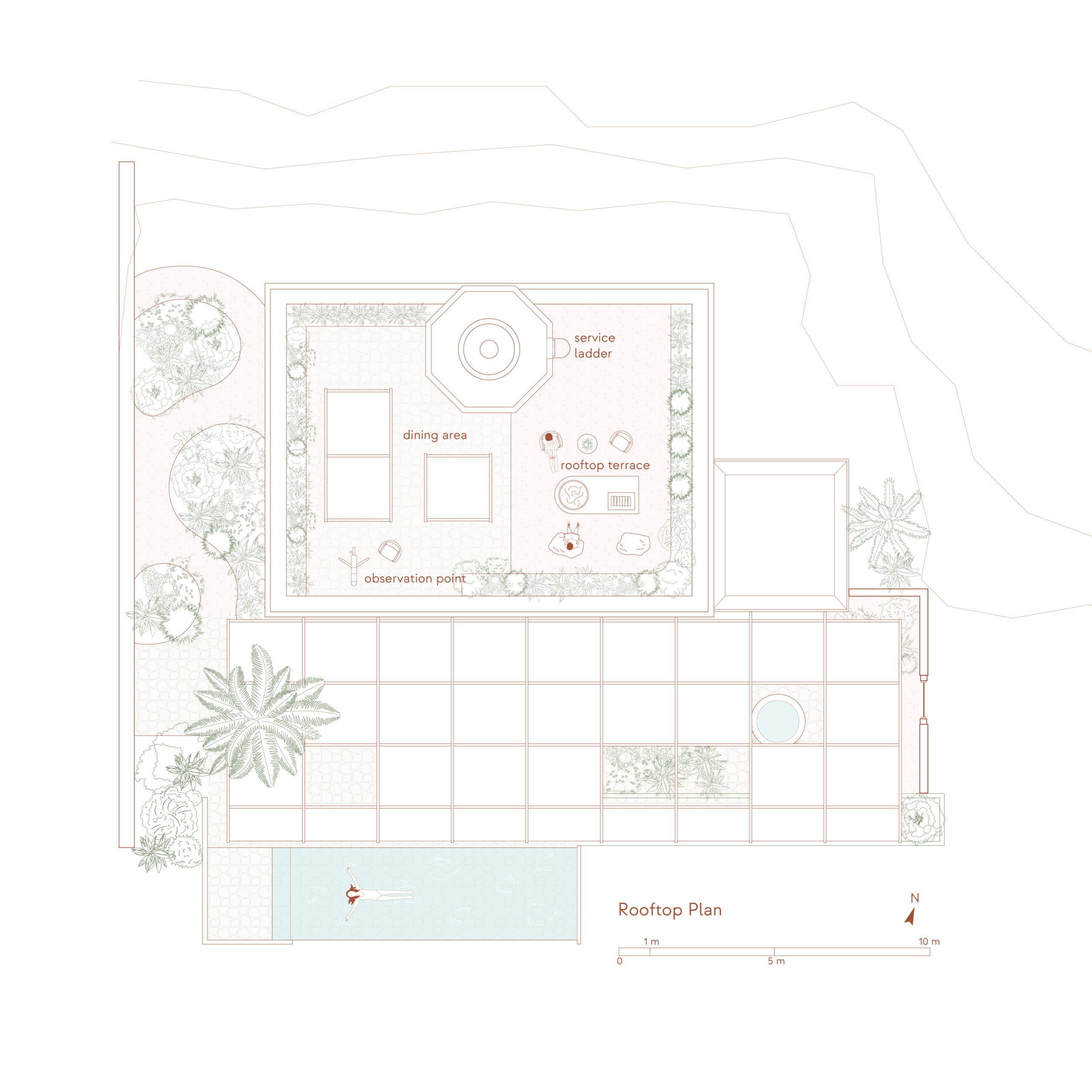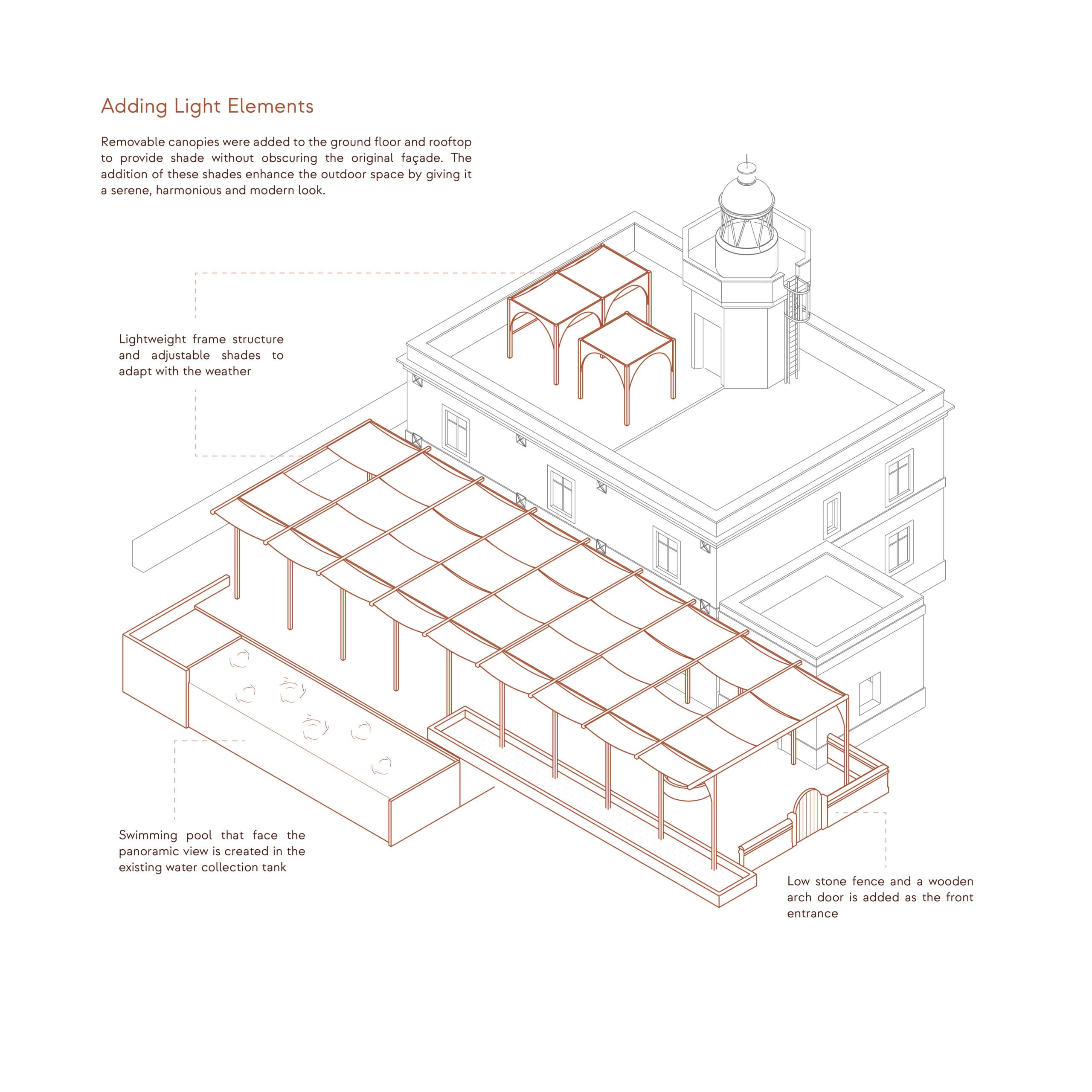 The original lighthouse could be enjoyed by accessing the rooftop via a spiral staircase, where it meets the dining area that serves as a relaxation and observation space. Here, guests can bathe in the breathtaking views of the sea and the Archipelago. Removable canopies were added to the ground floor and rooftop to provide shade without obscuring the original façade. The addition of these shades enhances the outdoor space by giving it a serene, harmonious and modern look.